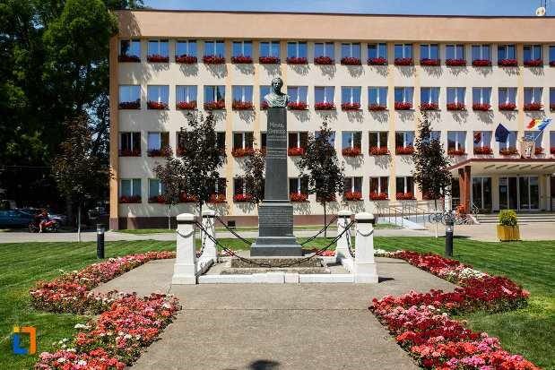 Bustul poetului în mărime naturală a fost sculptat în București și aşezat pe un soclu înalt de marmură neagră, împrejmuit cu patru stâlpi de marmură albă, legaţi între ei cu lanţuri. După dezvelirea monumentului acoperit cu o amplă pânză tricolor, festivitatea a fost deschisă de directorul școlii, urmată de un Te Deum și sfințit cu apă adusă din Râul Iordan, pe fondul muzical al „Doinei” eminesciene cântată de grandiosul corp al celor șase coruri reunite. Dintre cuvântări s-a remarcat cea a poetului Ion Minulescu, ministrul Culturii și cultelor. În final, reprezentantul Academiei Române, în persoana poetului academician Octavian Goga, un împătimit de Eminescu și militant pentru Marea Unire din 1918, a ținut un discurs impresionant. Tocmai de aceea din amplul text rostit cu patos patriotic vom reține câteva pasaje care sintetizează cel mai bine semnificația acestei sărbători naționale, organizată la Sânnicolau Mare, considerat o bornă de hotar la granița dintre fosta Austro-Ungarie și actuala Românie Mare, acțiunea fiind pusă sub egida unui cunoscut dicton: